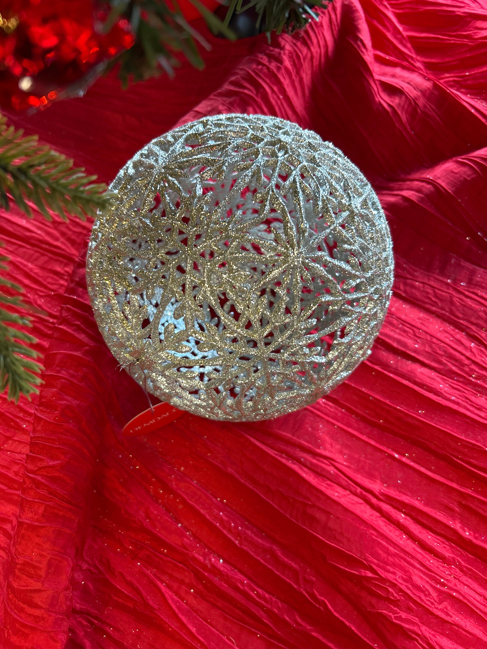 8” round silver glitter ornament made up of snowflake shapes. Place on your table, mantle or under the tree.
