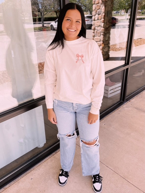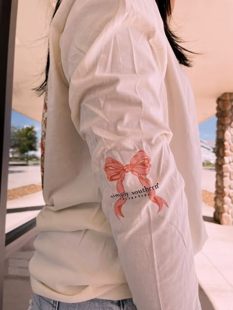 Linen cream long sleeve shirt with the phrase 'Follow the word, not the herd' and a highland cow surrounded by flowers. Simply Southern logo below, on left chest, and on right sleeve. 100% cotton. Unisex sizing.