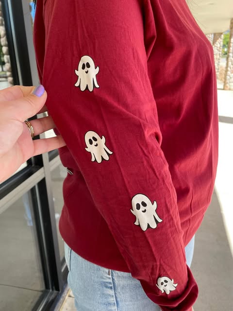Carmine red long sleeve shirt with the phrase 'Hey pumpkin' and a large jack-o-lantern wearing a scarf and witch hat surrounded by bats, ghosts, and the full moon. Simply Southern logo below and on left chest. Ghosts along right sleeve. 100% cotton. Unisex sizing.