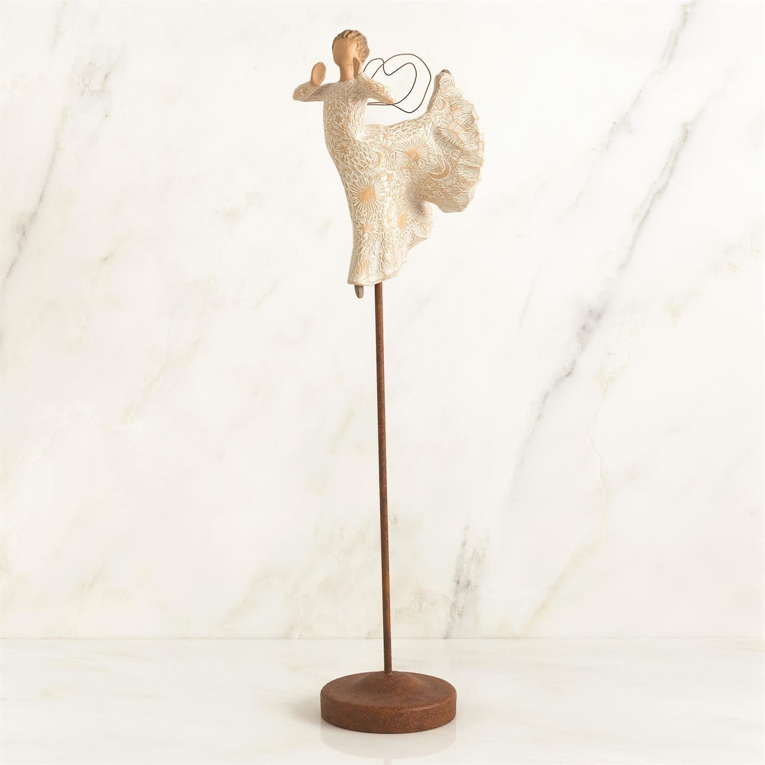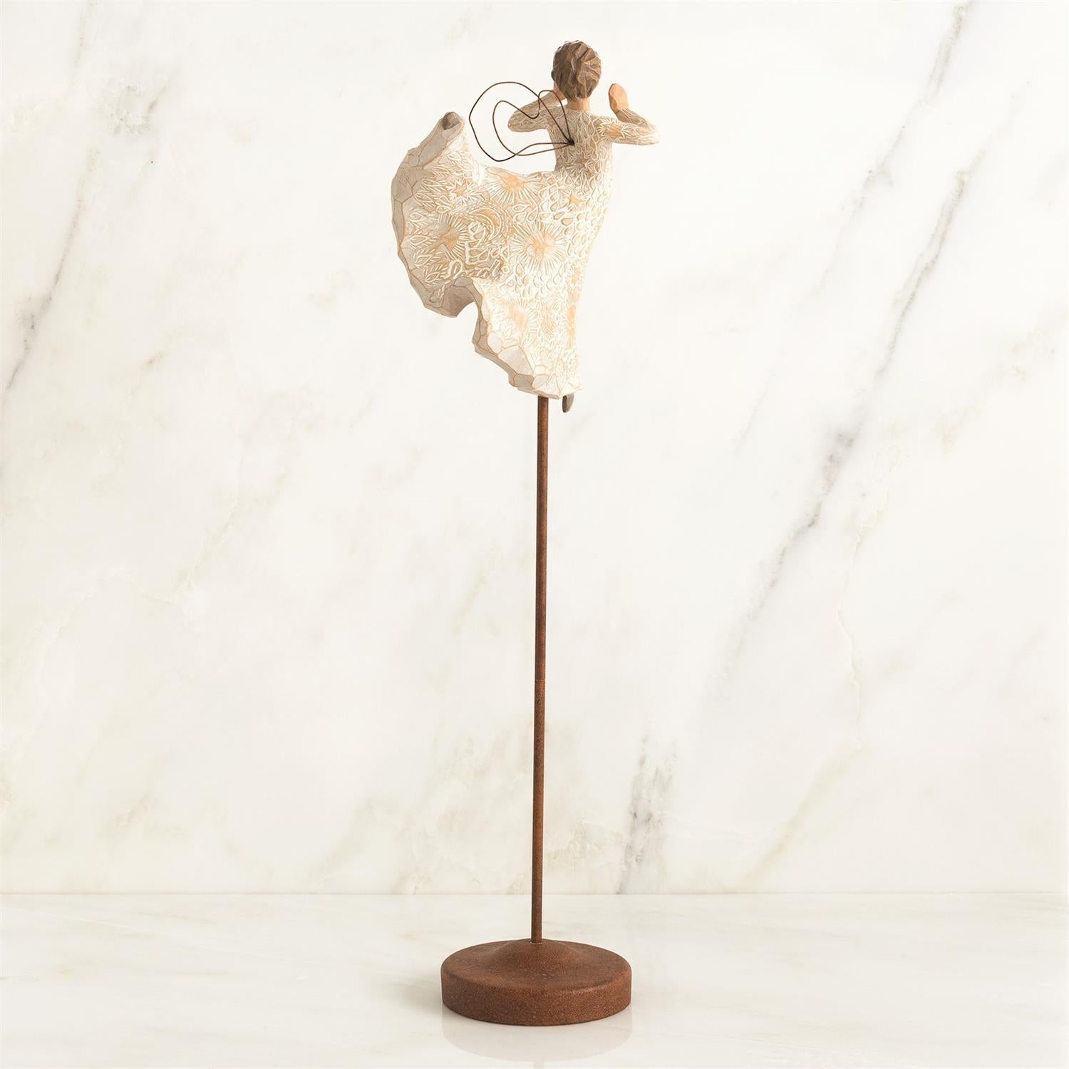 - 18”h hand-painted resin figure with wire wings. Figure is elevated on metal rod with weighted round base. Four-piece assembly