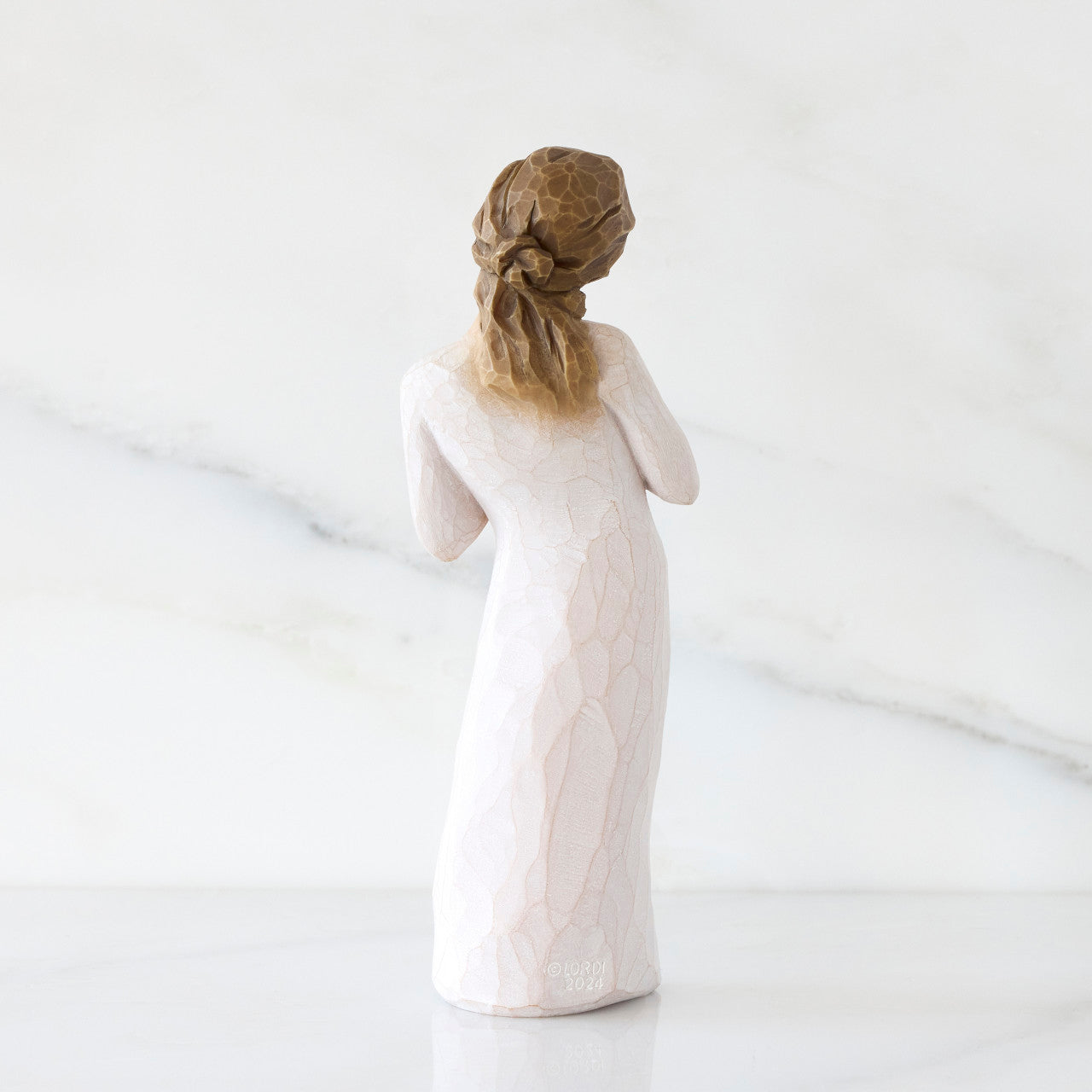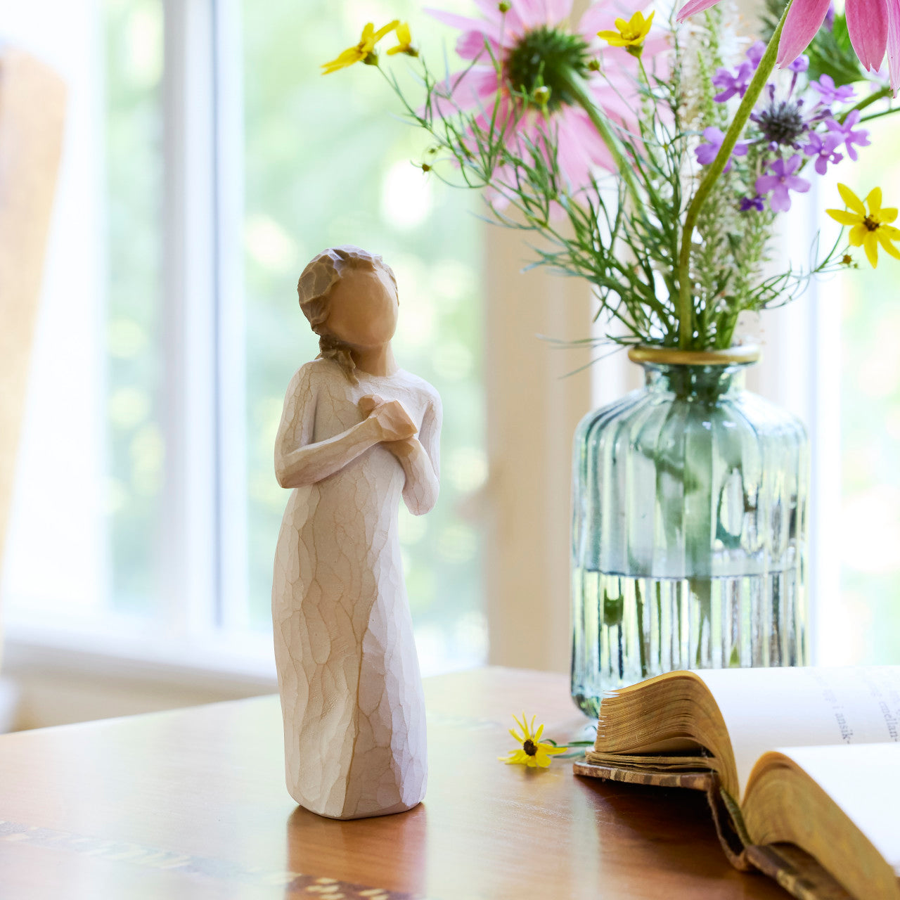 A figure with hands to heart and a comforting, quiet presence. A tangible symbol of connection and support representing empathy towards someone experiencing loss or hardship; a reminder of those who are thinking of you and wishing the best for you.