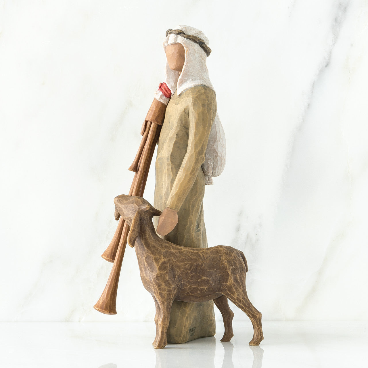 - Figure in olive-colored grament with brown goat at his side, carrying set of reddish-wood bagpipes with white bag over shoulder. Sized to complement the Willow Tree Nativity Set